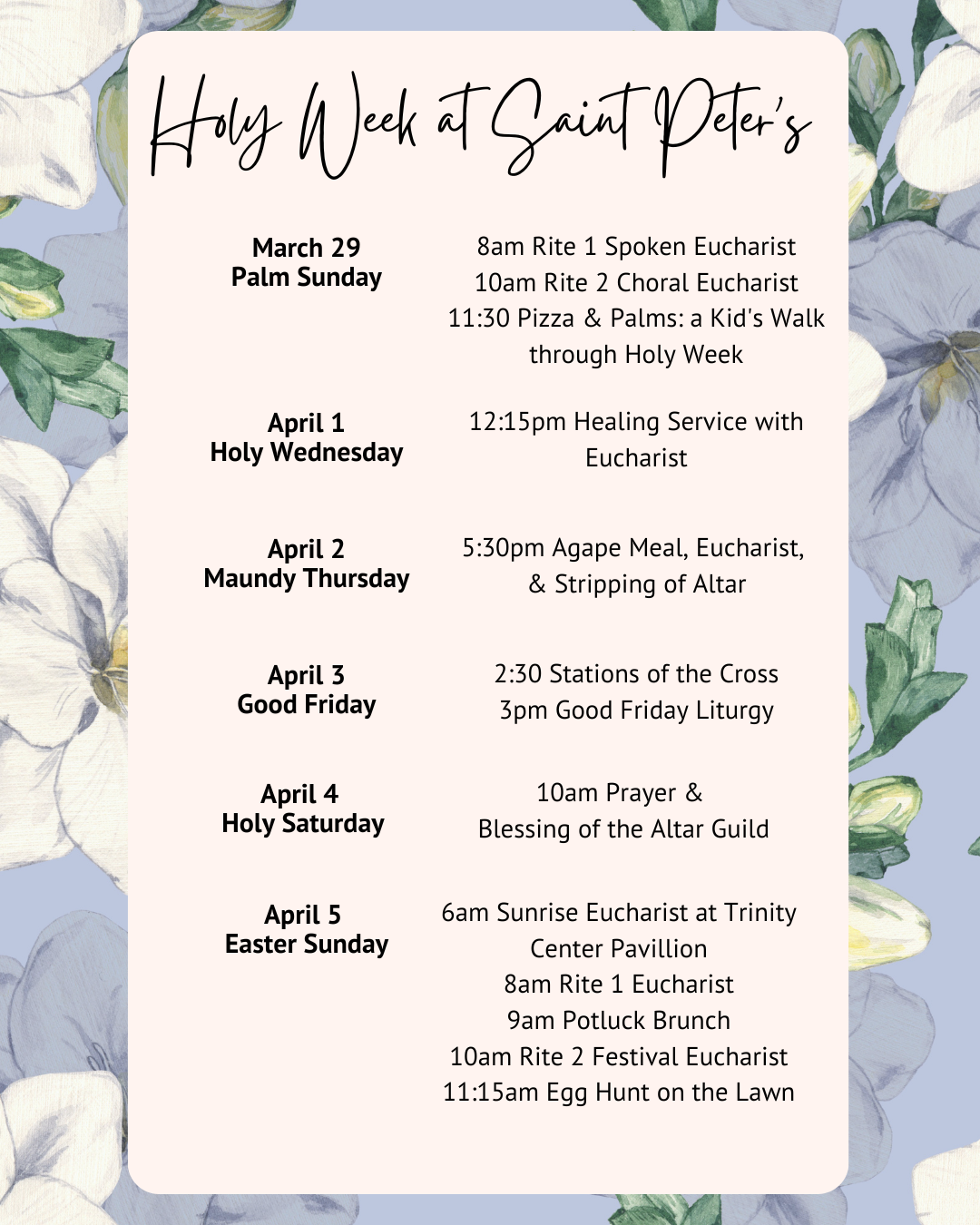 Welcome to St. Peter's Episcopal Church, located in the heart of the friendly city by the sea. We are an inclusive community that affirms the dignity of all people. We are imperfect people striving together to love God and love our neighbors the way Jesus taught us. We hope you will join us for worship, connect with us in fellowship, grow with us in study, and serve the community through outreach. All are welcome at St. Peter's!